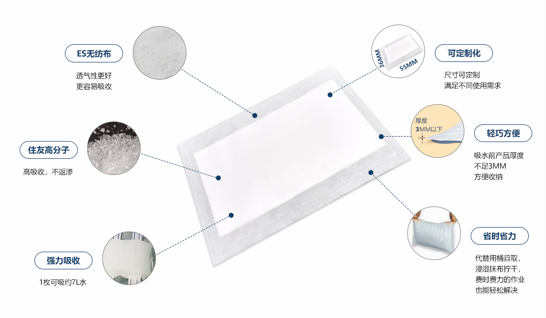 采用ES无纺布+锁水复合纸核心材质,产品尺寸33X55cm,快速吸收并锁止液体。符合相关安全标准,支持规格、包装与紧急标识定制。