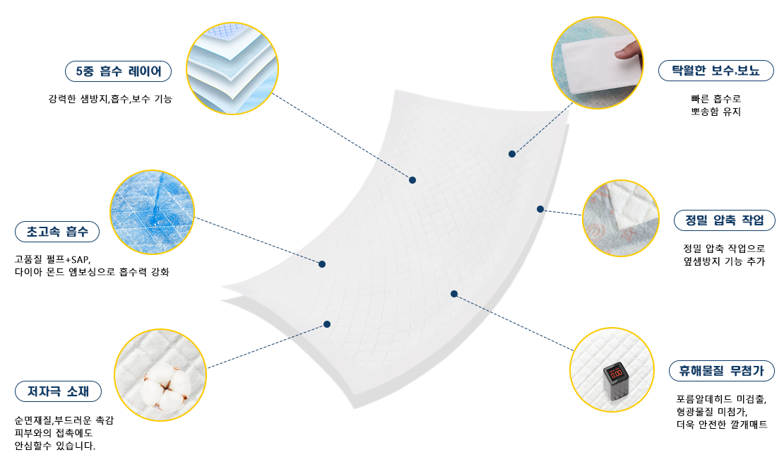 「5중 레이어」부직포/티슈페이퍼/펄프+SAP/티슈페이퍼/PE 방수필름